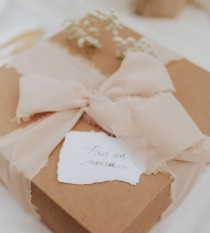 Casamentos mais formais costumam utilizar embalagens com acabamento refinado, como papéis especiais, relevo, laços de cetim e detalhes elegantes.